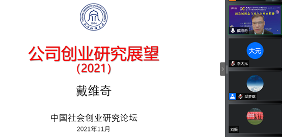 副院长戴维奇教授应邀在线上出席了创业管理学科发展研讨会,并作题为《公司创业研究展望(2021)》的大会报告。他对组织层面创业研究进行了较为系统的回顾,指出了2021年的最新研究进展,并对未来研究进行了展望。