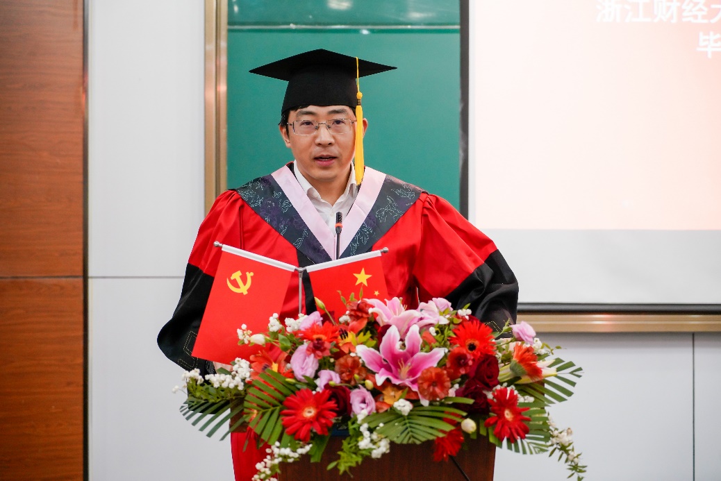 院长王建明教授发表了热情洋溢的讲话。他代表学院向顺利完成学业的2022届毕业生表示祝贺,鼓励同学们拥抱变化,永立潮头。同时寄语毕业生以下四点希望:一要不忘初心,终身学习,在新的行业和领域能不断学习,翻篇归零再出发 ;二要走出舒适区,勇挑重担,树立远大理想抱负,成就人生理想;三要调整心态,不断努力,低调做人,高调做事;四要懂得尊重与包容,无论在社会还是家庭中,尊重他人也赢得他人的尊重。最后,王院长祝愿各位毕业生“此去繁花似锦,归来仍是少年”,欢迎毕业生常回家看看。