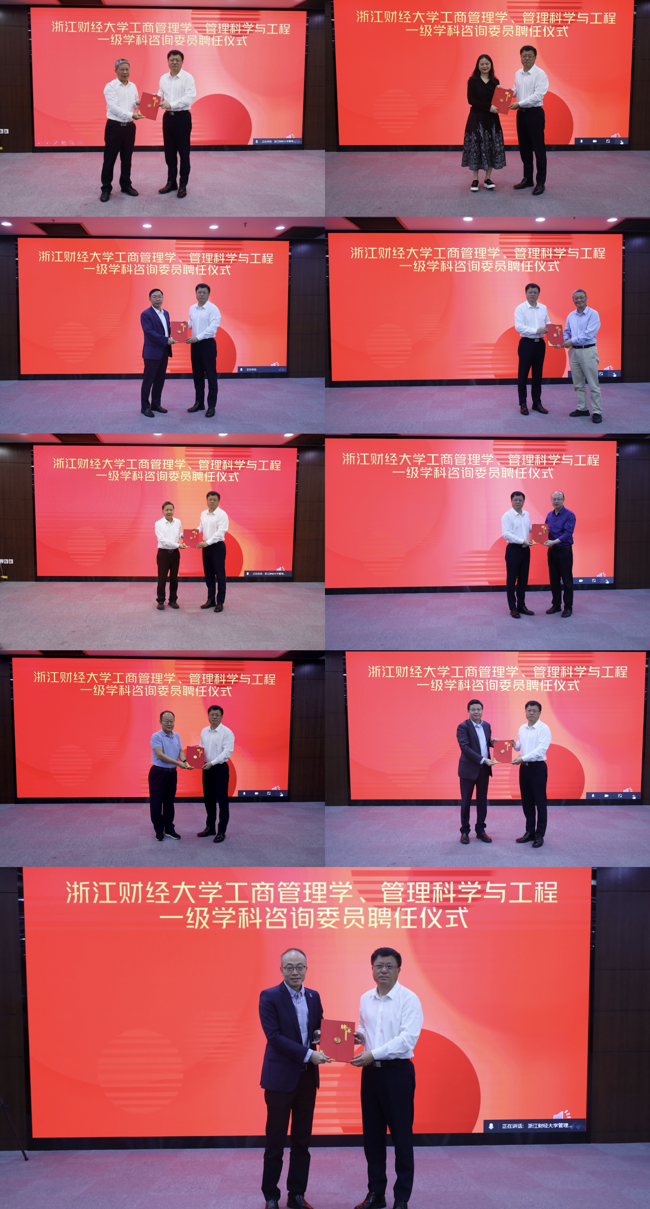 会议举行了工商管理学、管理科学与工程一级学科咨询委员会委员聘任仪式,魏江校长为线下参会的9位委员颁发聘书。