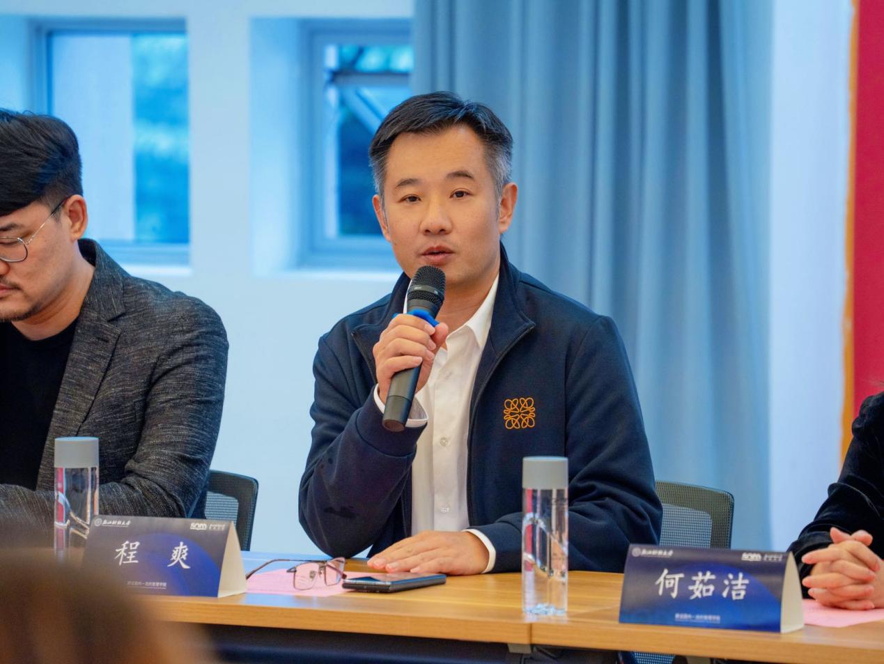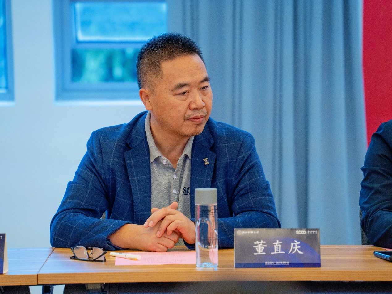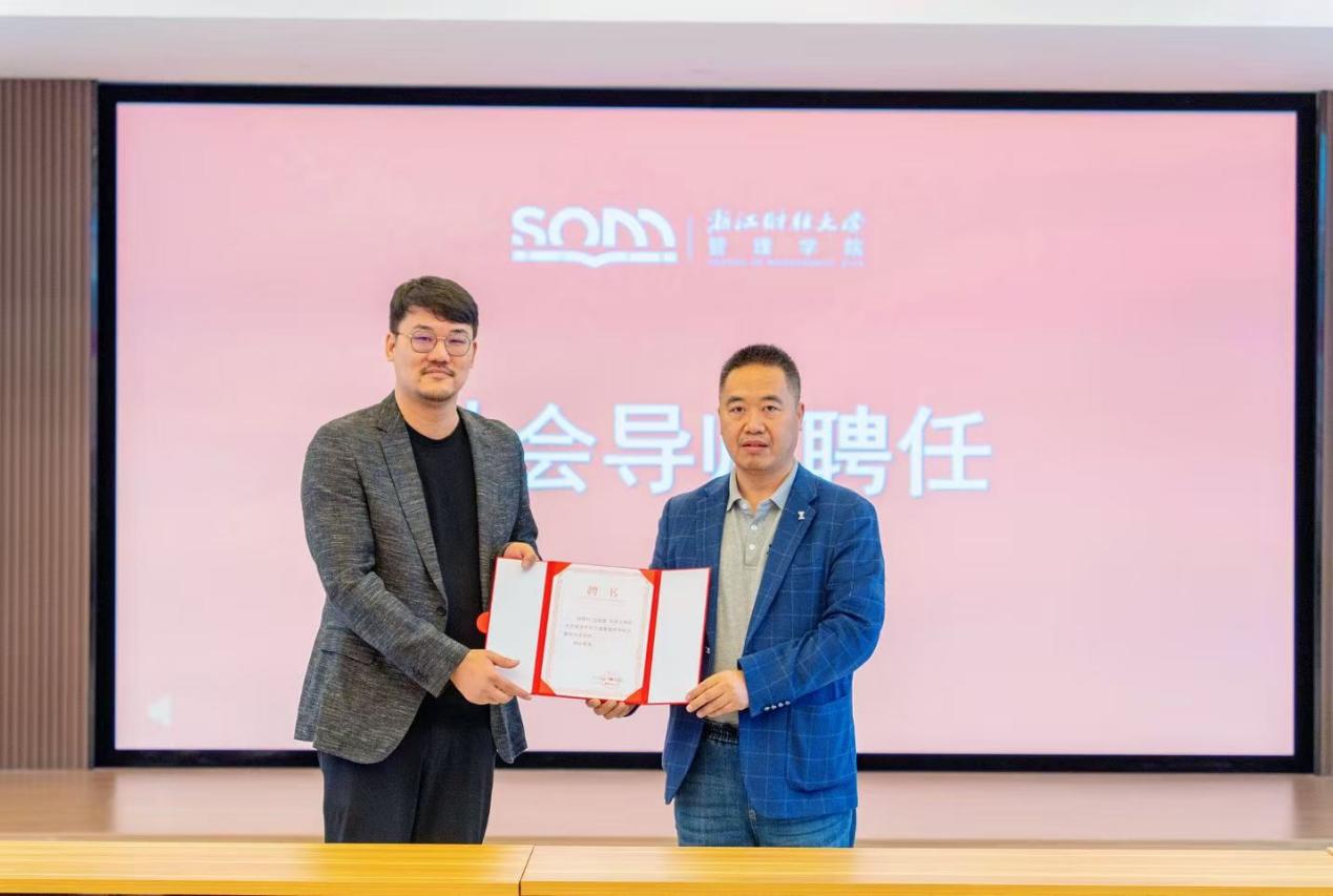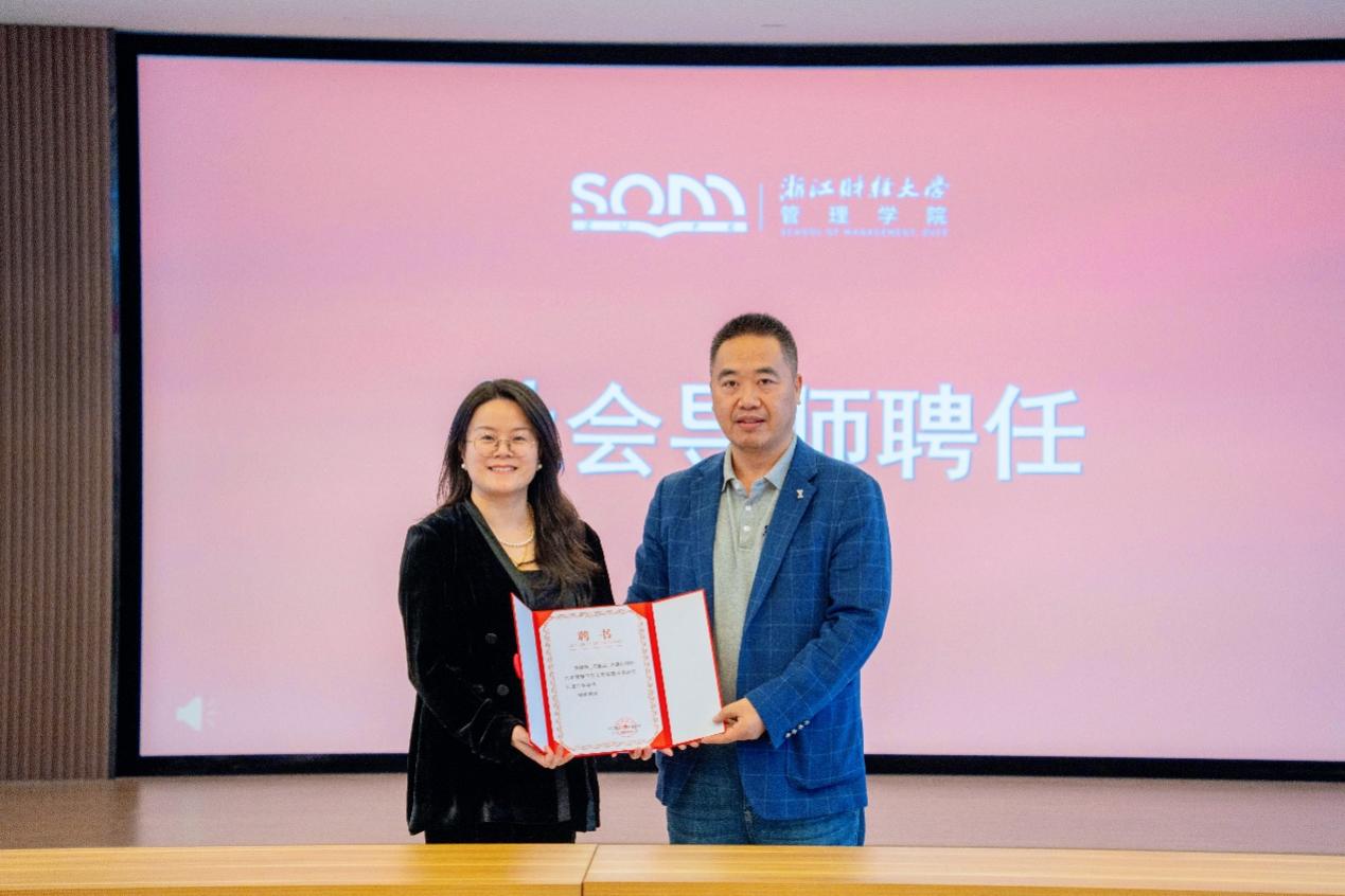学院院长董直庆为竺俊景董事长、何茹洁总经理颁发跨学科创新班社会导师聘书,并宣布肉漫屋