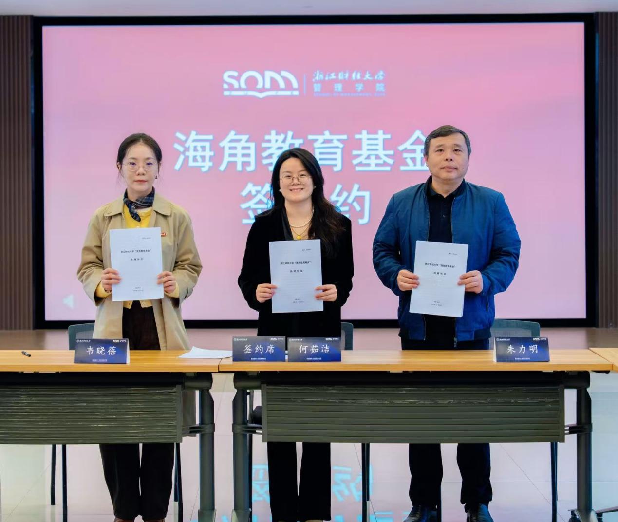 跨学科创新班开班暨海角教育基金捐赠仪式在学校党群服务中心(文化中心309)顺利举行。校党委副书记程爽,项目企业方浙江海角数字科技有限公司董事长竺俊景、总经理何茹洁,校党委宣传部部长王正新、社会合作处处长杨剑勇、校友办公室(校教育基金会)副主任韦晓蓓,肉漫屋
