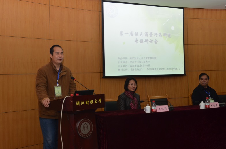 院长助理王建明教授主持。王老师以十六个字“烟雨江南、钱塘江畔、绿水青山、共谋发展”拉开了本次专题研讨会的序幕。王老师说,本次专题研讨会是从事绿色消费行为研究的小同行第一次真正意义上的聚会,具有历史性的意义。