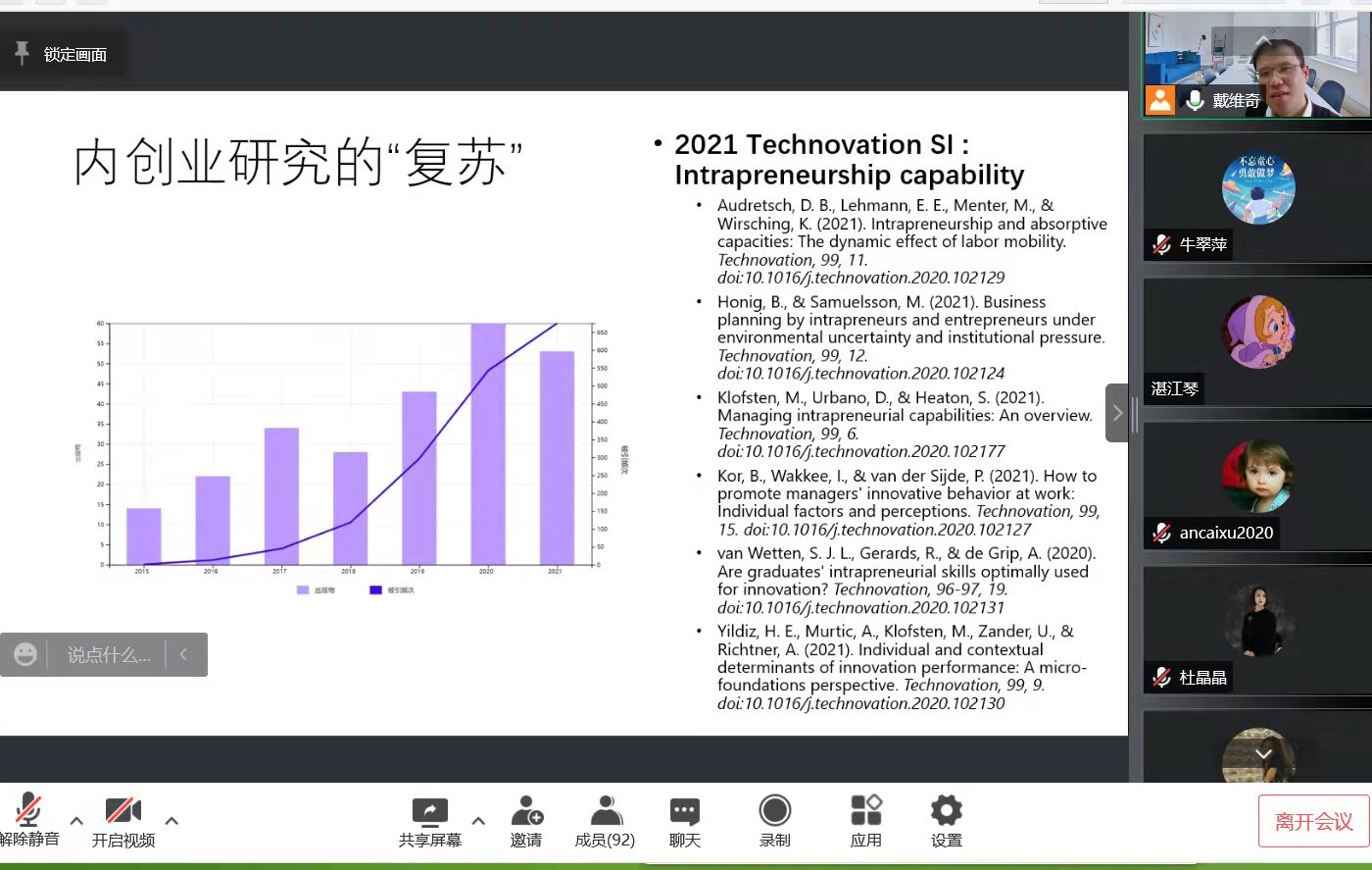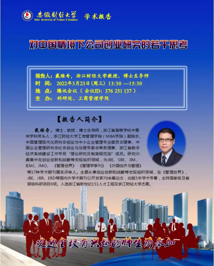 副院长戴维奇教授应邀为安徽财经大学师生做了一场题为《对中国情境下公司创业研究的若干思考》的线上学术报告。南开大学商学院张玉利教授对报告进行了专业点评。会议由安徽财经大学工商肉漫屋