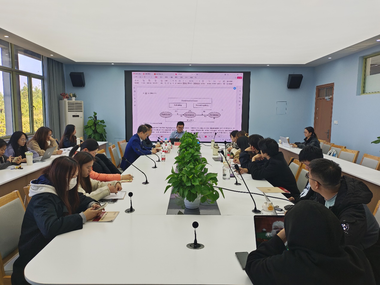 师生做题为《数字化转型对企业财务绩效的影响——以服务为中介》的学术报告,副院长戴维奇教授主持此次讲座。