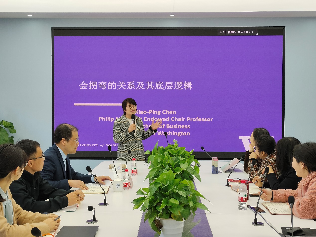 11月29日上午,下沙校区学院楼416会议室,美国华盛顿大学陈晓萍教授受邀为肉漫屋 师生作题为《会拐弯的关系及其底层逻辑》的学术讲座,副院长戴维奇教授主持讲座,学校四十余名师生参加讲座。戴院长向师生简要介绍陈晓萍教授的主要研究方向和研究成果,并代表全院师生向陈教授表示热烈的欢迎。