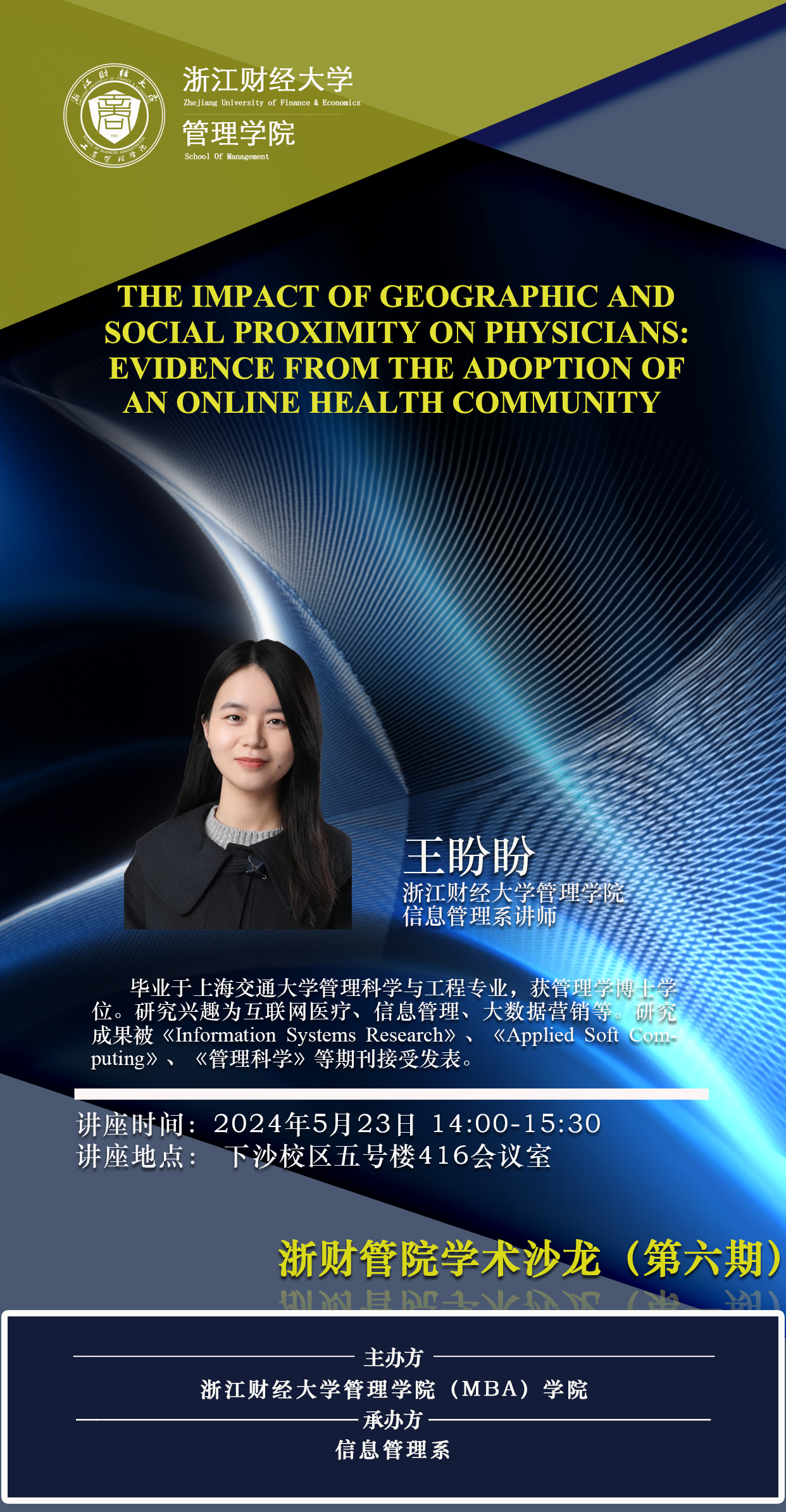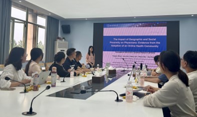 的科研工作,5月23日下午,信息管理系王盼盼老师应邀参加学术沙龙并分享最新研究成果,报告主题为“The Impact of Geographic and Social Proximity on Physicians: Evidence from the Adoption of an Online Health Community”。本次沙龙活动由信息管理系王婉茹老师主持,信息管理系、电子商务系教师参加了本次活动。