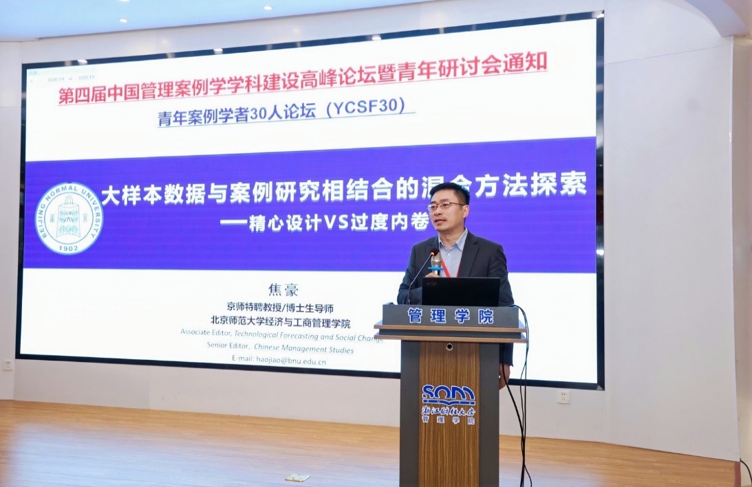 紧接着,北京师范大学焦豪教授进行了点评报告,他先对田莉教授进行的研究给予了肯定,提出像田莉老师这样精心设计的研究才是真正需要的研究。同时,焦豪教授分享了三篇采用混合研究方法的文章,他认为论文需要对研究问题进行一个精心的设计,要根据实际研究需要采用混合研究方法,而不应该为了体现工作量“过度内卷”。