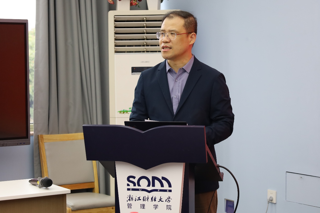 副院长戴维奇教授介绍了两个学位点为本次评估会议所做的准备工作情况。随后,他代表工商管理学硕士学位授权点向专家汇报了五年来学位点的建设情况,具体围绕二级学科及特色、学科队伍、人才培养、培养环境和条件等方面展开,最后总结了学位点存在的不足和改进计划。