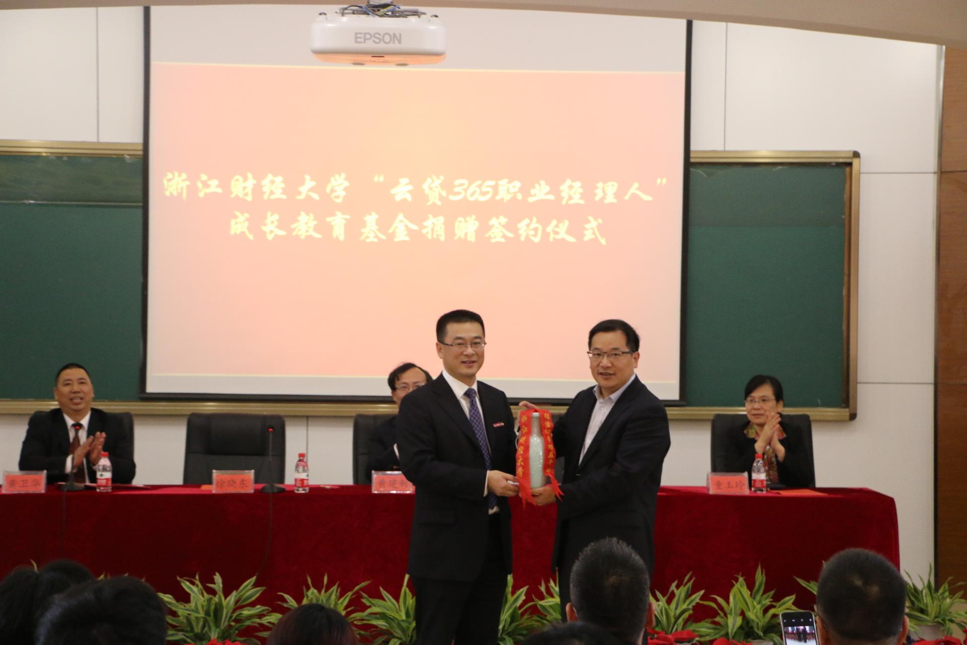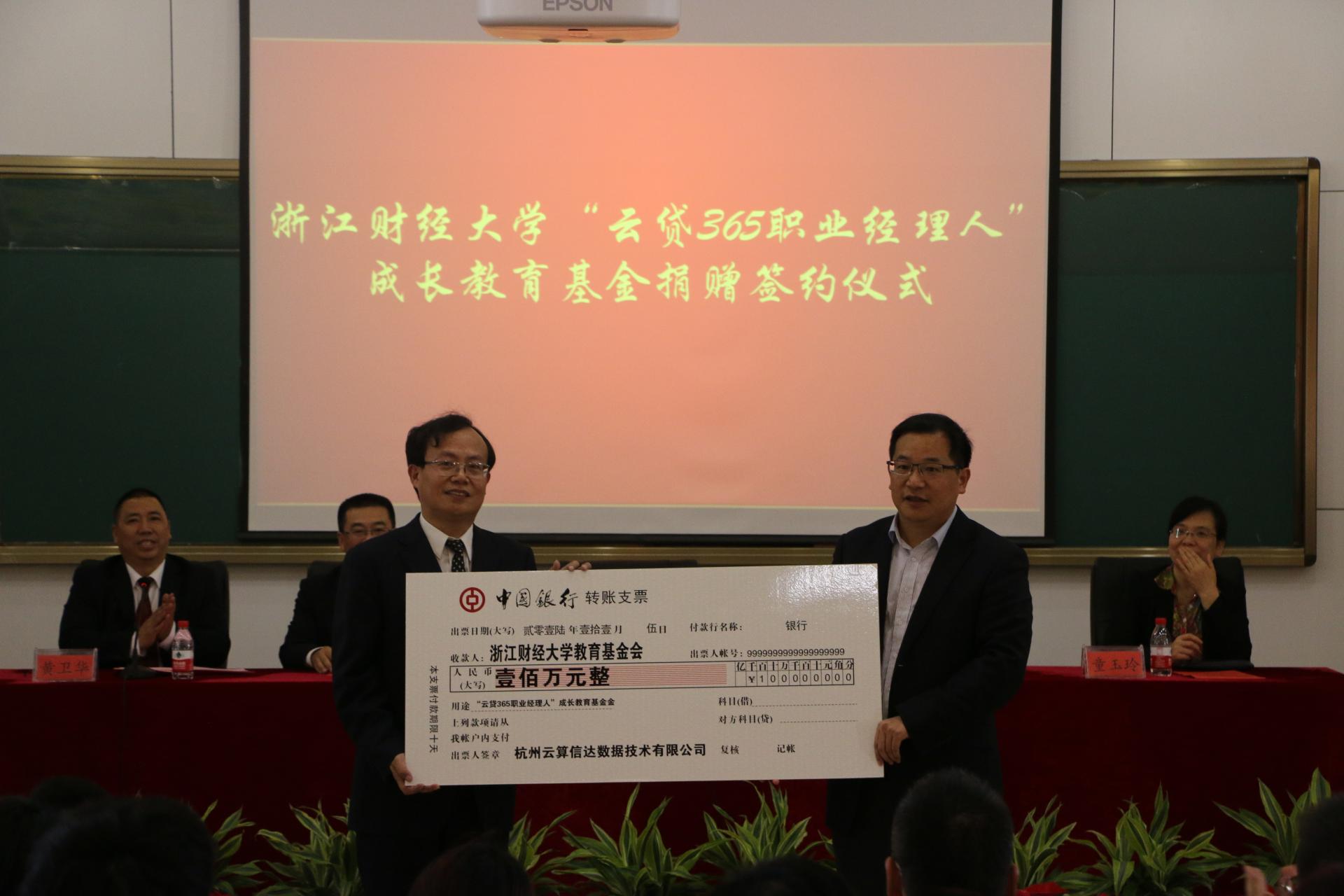 (MBA学院)2010级MBA校友、杭州云算信达数据技术有限公司负责人代表公司向母校捐款100万元,设立云贷365职业经理人成长教育基金。副校长黄建新,校党委委员、宣传部长徐晓东,财务处、研究生院、工商管理(MBA学院)等部门代表,以及校友和在校生代表参加了捐赠仪式。
