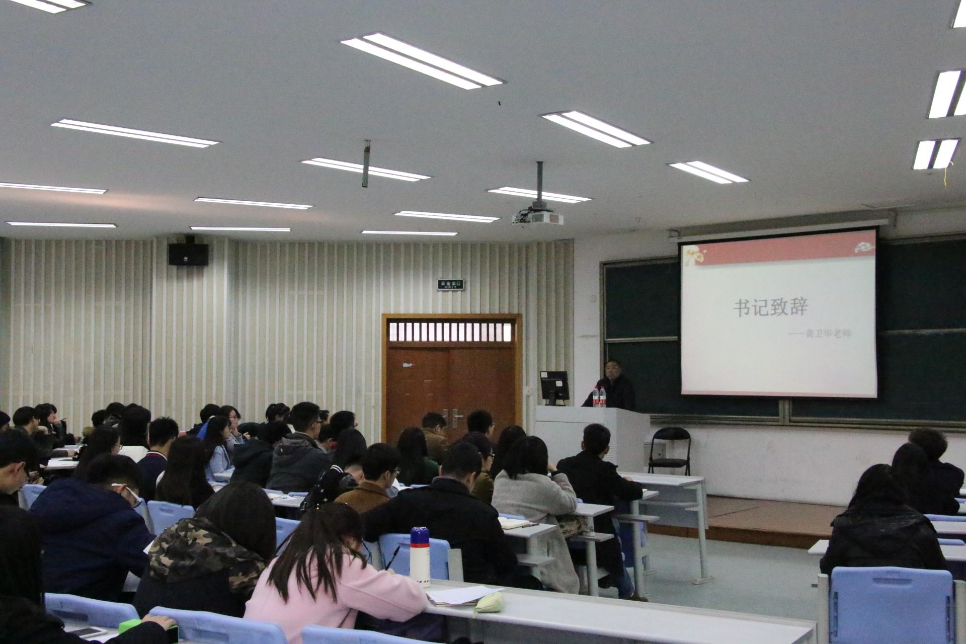 向“省内一流,国内知名”这一目标迈进,同时强调了“学生是最好的载体”。在学生培养这一工作方面,他传达了与董进才院长达成的共识,要将学生培养成具有良好的文化底蕴,扎实的专业功底,充分的务实能力以及良好的社会责任感的儒雅的企业家。除此之外,在学生干部工作方面,黄卫华书记首先赞扬了学生干部的高能力,高素质以及社团活动的魅力;之后,他提出建议,对于个人,要学习成功的经验,成功的思维,将成功变成一种习惯;对于学生工作者,应当合理支配时间,强调“当管理内化成自觉行动,当管理成为自觉自愿的行动,当管理成为大家认为应该做的事情,才是学管理的最高境界“,大家应当将学生干部这一工作视为一次历练,从失败与挫折中反省并提升自己。
