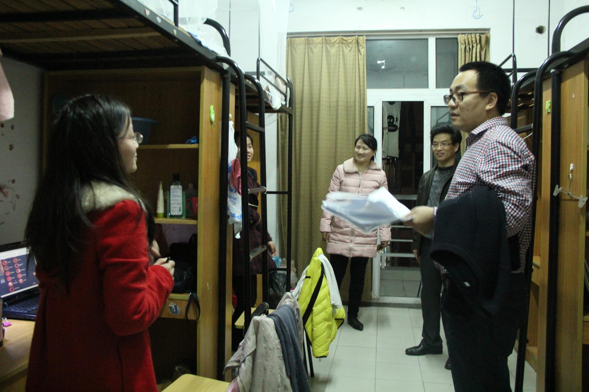 文明寝室建设,积极配合省教育厅到我校全面检查工作,学院领导于2016年3月7日晚到成蹊苑生活园区进行了寝室大检查,参加此次检查工作的领导有学院院长董进才老师、党委书记黄卫华老师、副院长谢敏老师,以及学办主任胡星平老师、团委书记刘远琳老师以及辅导员俞佳、喻一珺、余亮等老师。他们分别对成蹊苑51#、49#、57#、31#、44#、48#等工商肉漫屋