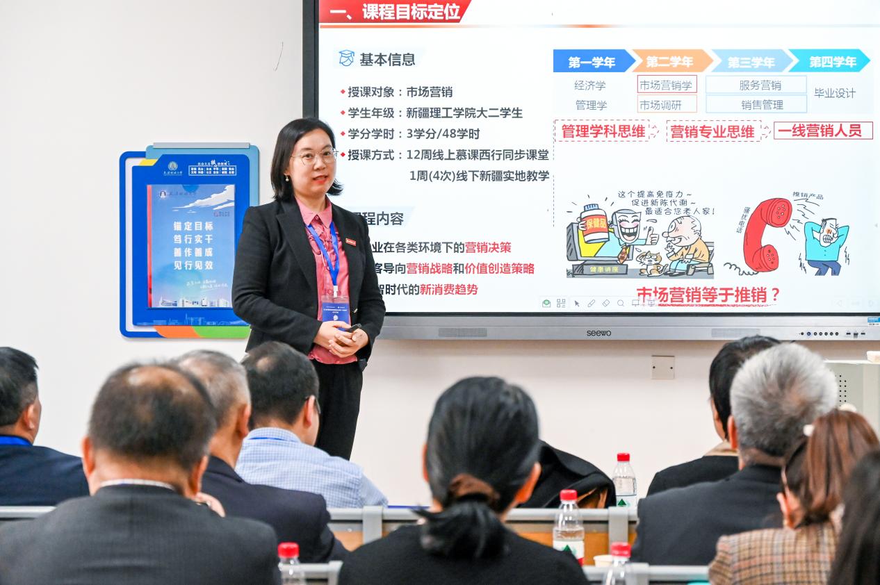 方案。在后续的现场教学环节,陈颖老师以“市场营销观念的演化”这一核心知识点教学节段为例,生动呈现了新疆学生从棉纺产品的文创设计入手,不仅传递大美新疆好风光,也时刻关注新疆乡村扶贫的民生温度,再到柯柯牙绿色精神的再创意,最终形成并深度实践“文化润疆”的营销观念,将理论讲解与实践应用融会贯通,获得现场评委一致肯定与好评。