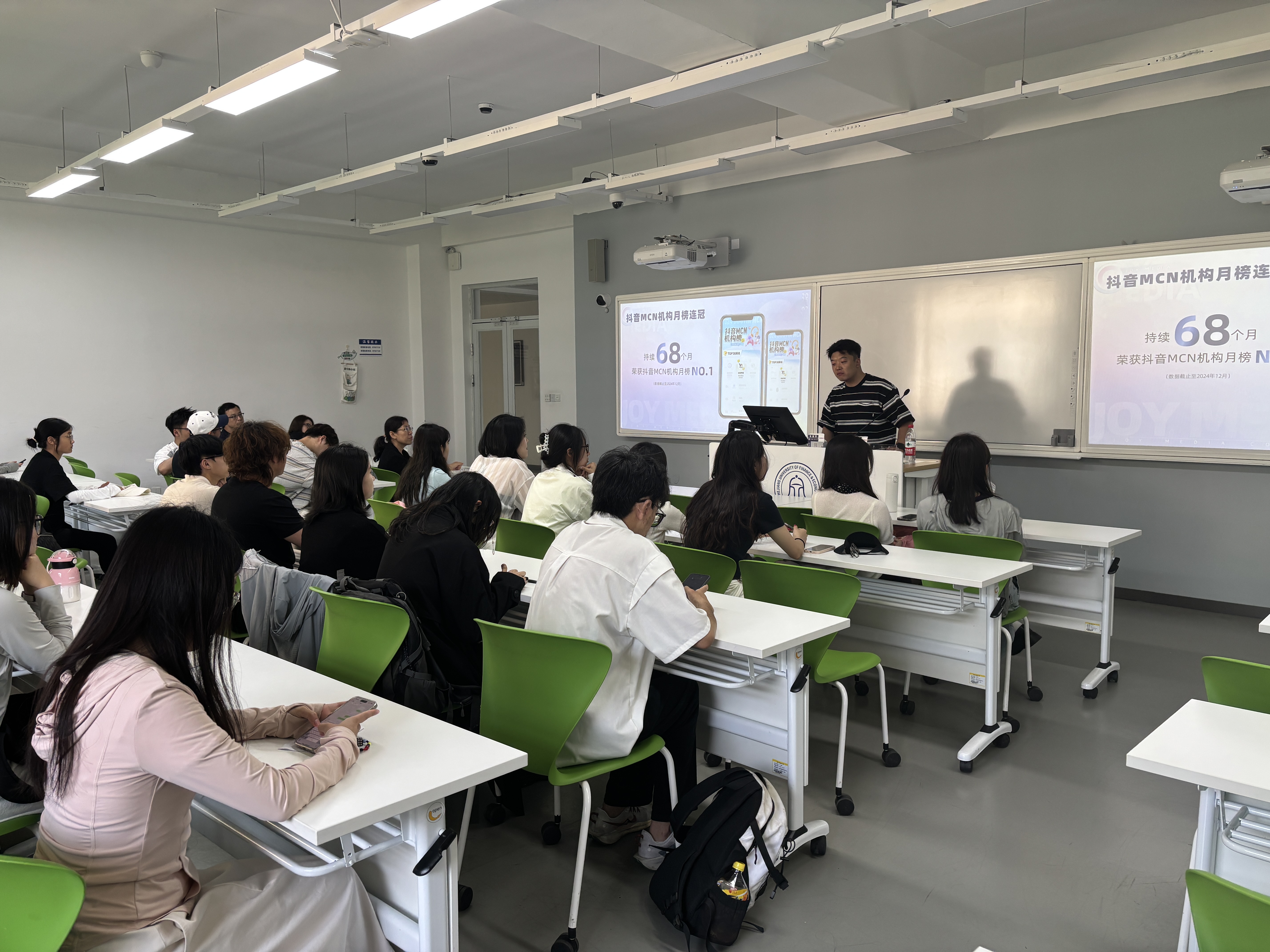 活动伊始,无忧传媒短视频负责人朱亚斌先生便以其深厚的行业洞察,为同学们带来了新媒体行业的深度剖析与实战技巧。他以无忧传媒的爆火KOL为例,系统讲解了从爆款内容打造到个人IP塑造的方法论,并详细介绍了无忧传媒的业务实力、成熟的IP孵化体系,以及成为合作KOC的具体路径、支持政策与丰厚回报,简直就是干货满满!这瞬间点燃了现场同学们的求知热情。大家全神贯注,踊跃提问,热烈探讨着新媒体创作的各种可能性。
