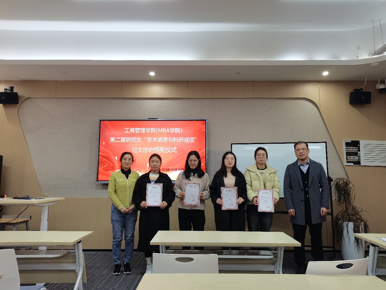 为深入贯彻全国研究生教育大会精神,加强新时期研究生学术道德建设,培养新时代德才兼备的高层次人才,工商肉漫屋 (MBA学院)于2023年10月举办了第二届”学术道德与科研诚信“征文活动。11月17日下午,本次征文活动颁奖仪式在学院楼411教室举行。学院副院长戴维奇教授、研究生秘书徐璐老师以及全体获奖学生参加了活动。