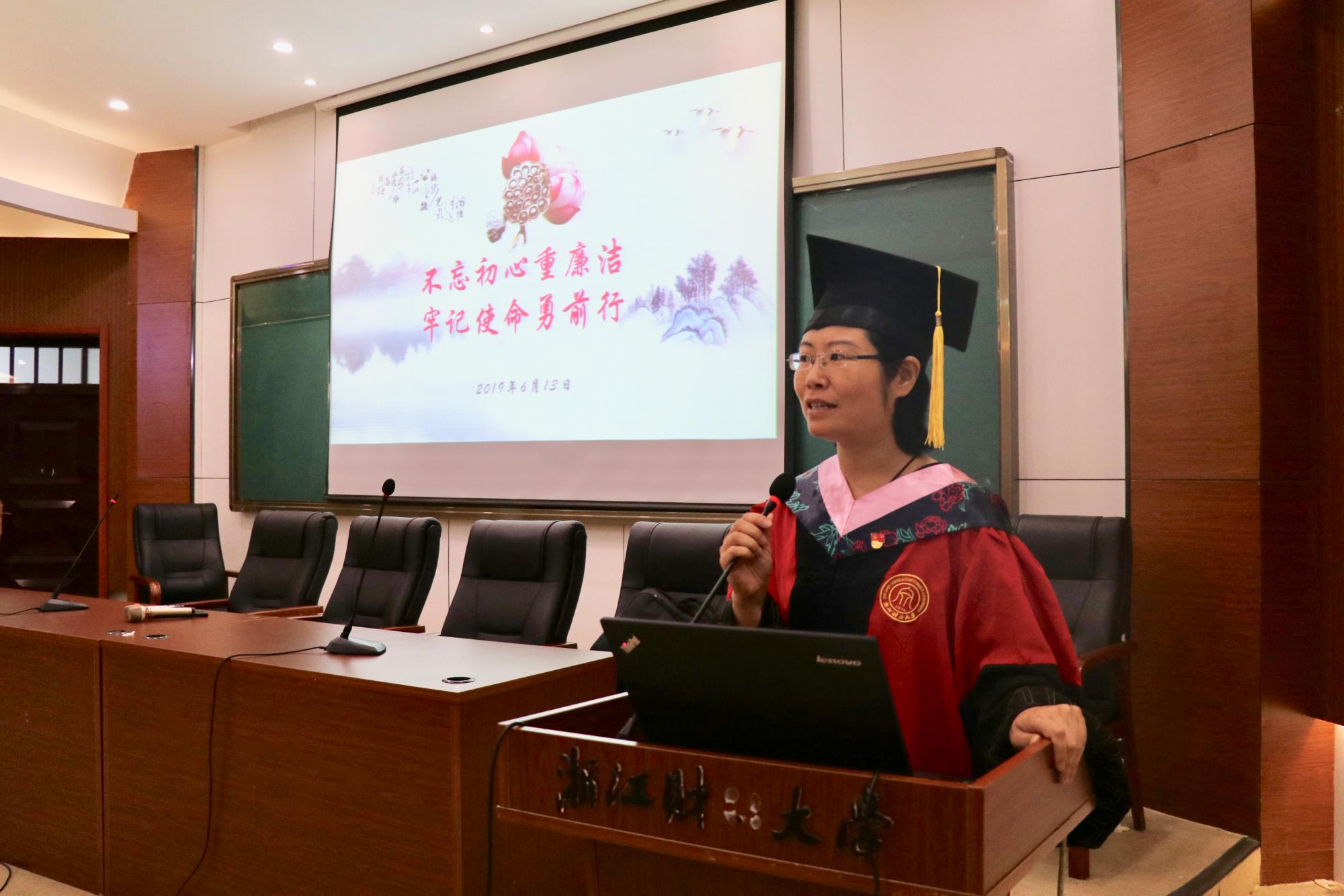 2019届全体毕业生党员在学院楼217会议室参加了主题为“不忘初心重廉洁,牢记使命勇前行”的在浙财最后一次党日活动。学院党委书记黄卫华,学院院长、党委副书记董进才,党委副书记、纪委书记谢敏,工会主席、党委委员郭军灵,各学生党支部书记出席活动。活动由学院党务秘书、学生第四党支部书记周衍彤主持。