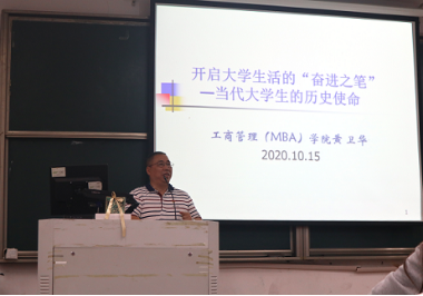 随后,黄卫华以“开启大学生活的‘奋进之笔’——当代大学生的历史使命”为主题,首先分享了自己大学生活经历与体会,并介绍了学校与学院基本情况,强调党建引领、全员育人、职业经理人与未来企业家培养是学院人才培养特色。