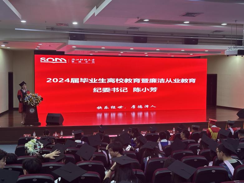 组织2024届毕业生开展“清风启程 廉洁从业”主题教育活动。校党委委员、副校长兼学院院长董进才,学院党委书记朱力明,副院长张雷,副院长戴维奇,学术院长马祖军,各系主任,教师代表,班主任代表,毕业班辅导员,2024届395名学术型学位毕业研究生、MBA专业学位毕业研究生、留学生、本科毕业生和毕业生家长参加活动。活动由学院党委副书记兼纪委书记陈小芳主持。