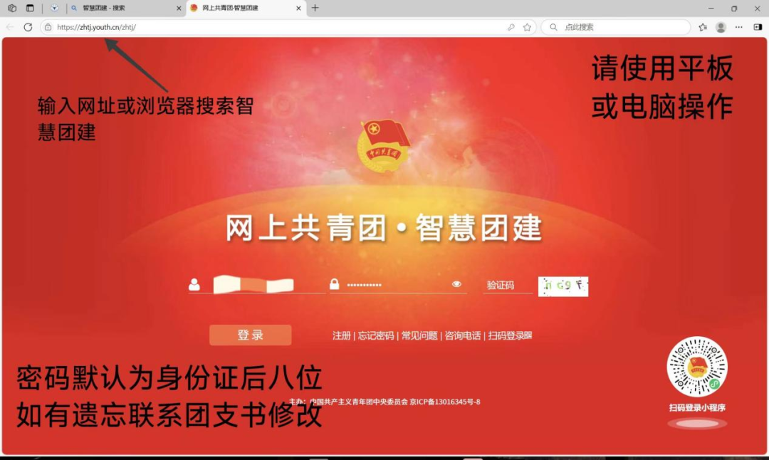 登录“智慧团建”系统://zhtj.youth.cn/zhtj/