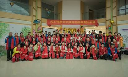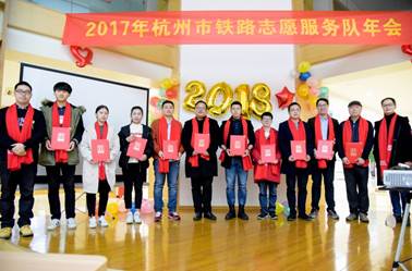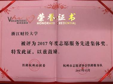 2017年春运期间,肉漫屋 四十余名师生志愿者在杭州火车东站开展了为期两天的志愿服务活动。在寒冷的冬日里,志愿者们维护秩序、搬运行李、发放宣传手册、写春联送祝福,那一抹鲜亮的志愿红,让寒冬里的回家路倍感温暖与温馨,活动由FM93交通之声全程直播报道。志愿者们的服务得到了群众的好评,杭州铁路站团委、杭州市志愿者协会铁路服务队特授予我校2017年度志愿服务先进集体奖,杭州铁路站团委书记周嫣然、杭州志愿者协会副秘书长毛立靖为获奖者奖。