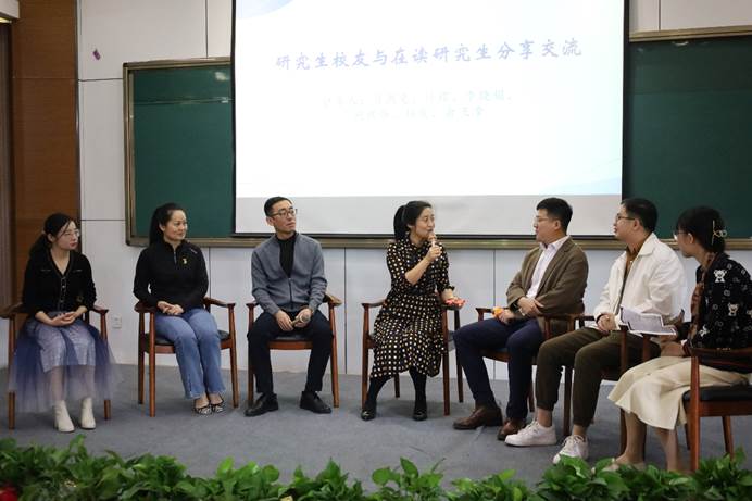 主题报告结束后,学院研究生秘书徐璐老师邀请肖剑斐、许诺、李晓娟、鲍祺烨、杨俊、俞飞滢六位校友与在读研究生分享交流。已经毕业多年的肖剑斐、许诺、李晓娟、鲍祺烨校友,结合自己对当前就业形势的分析,引导同学们将个人发展融入国家发展,希望同学们未来能奔赴的领域是精准服务国家重大战略,在国家重点发展领域深耕细作。初入职场的杨俊、俞飞滢校友,结合自己的求职经验在择业、求职方面对在校研究生进行了全面、细致的指导。他们强调研究生要沉下心来做研究,提升自己的专业素养。同时也要重视实习、实践,在岗位体验中提升对岗位的认知和自身综合素质。