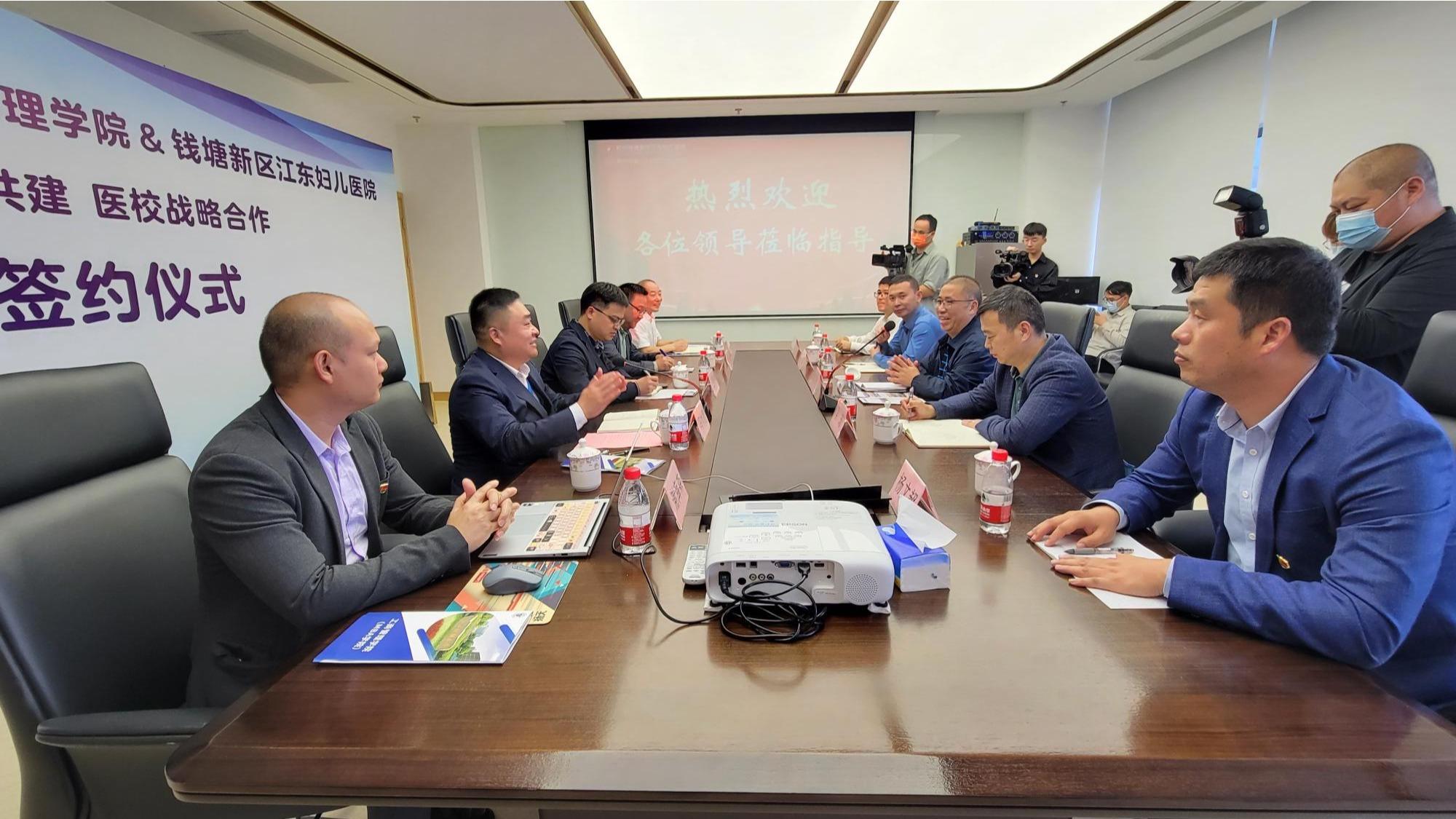 高云和黄卫华分介绍了医院和学院的发展情况和党建概况,双方希望通过战略合作和党建共建,加强党建共建与业务往来,实现资源共享、优势互补,进一步提升合作的深度和广度,开创基层党建合作新格局。王燕平在讲话中指出,这是首次钱塘区跨江医校合作,希望双方加强沟通与交流,共建互促、资源共享、优势互补,以共建强合作,以合作促发展,推动双方事业共同发展,推进健康事业迈上新台阶。