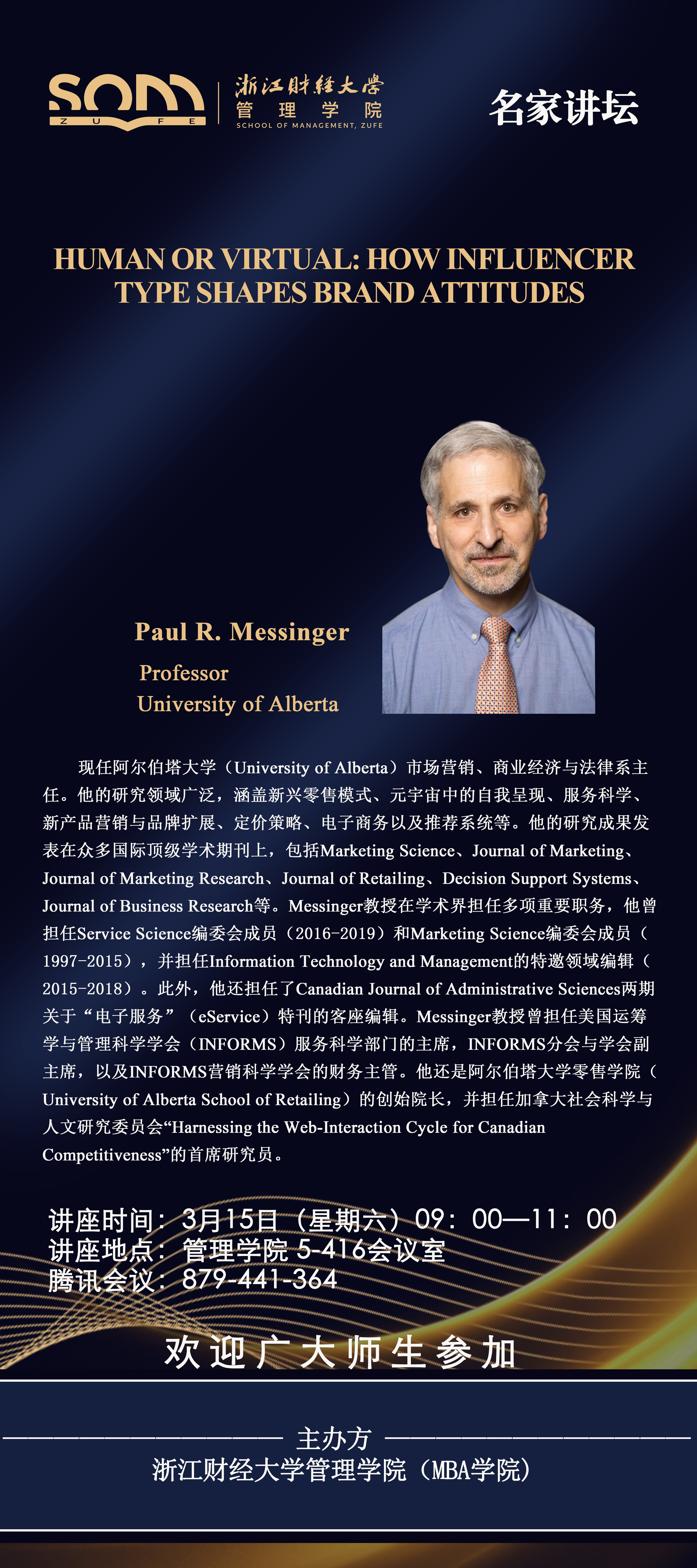 肉漫屋 新财经战略系列学术活动2025年第10期【名家讲坛】Paul R. Messinger:Human or virtual: How influencer type shapes brand attitudes