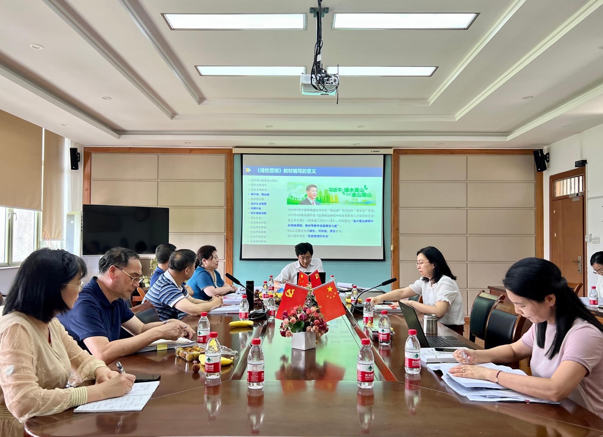 410会议室开展新形态教材《绿色营销:价值视角》研讨会,参会人员包括王建明、靳明、陈水芬、沈渊、倪文斌、赵辉,王跃梅、陈颖、阮锋儿,还包括数位讲师博士。活动由系主任陈颖主持。