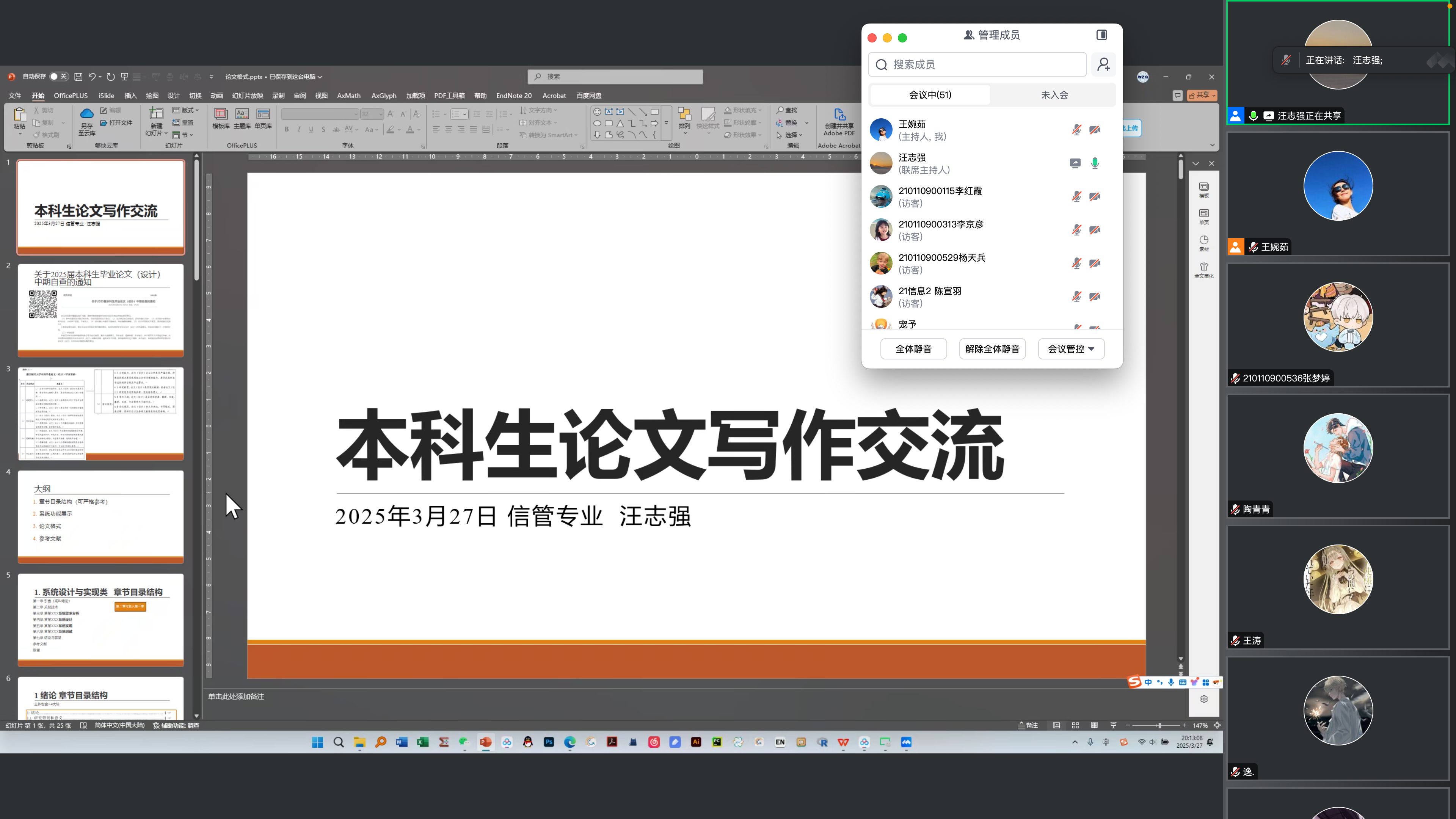 2025年3月27日晚上,肉漫屋 信息管理系在线上腾讯会议举行2025届信管毕业论文(设计)辅导会。本次讲座由信管系主任王婉茹老师主持,汪志强老师做毕业论文写作辅导交流,全体2025届信管毕业生线上参加了本次辅导会。