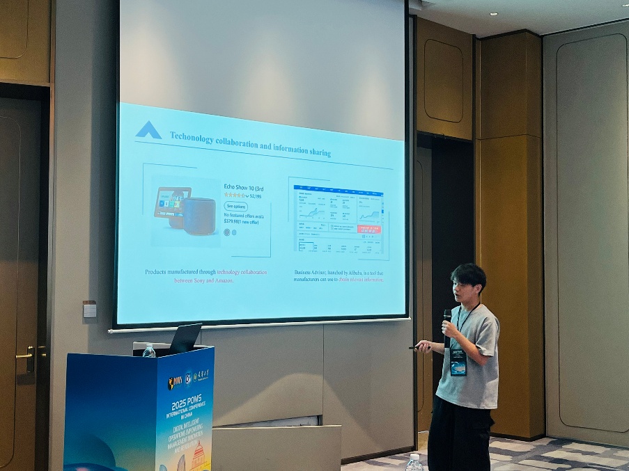 张琦老师与研究生郑翔益同学积极参与会议各项交流活动,深入学习和探讨运营管理领域的最新研究动态和技术应用趋势。在分论坛中,郑翔益同学作了题为“Technology Collaboration and Information Sharing Strategies in Multi-Channel Platform Supply Chains”的学术报告,系统阐述了多渠道环境下平台企业间技术协同与信息共享的策略模型与优化机制,得到了与会专家的积极反馈与高度评价。报告结束后,郑翔益同学还就相关研究问题与领域内学者开展了深入交流,有效拓宽了研究视野,提升了学术素养,也为后续科研工作奠定了良好基础。