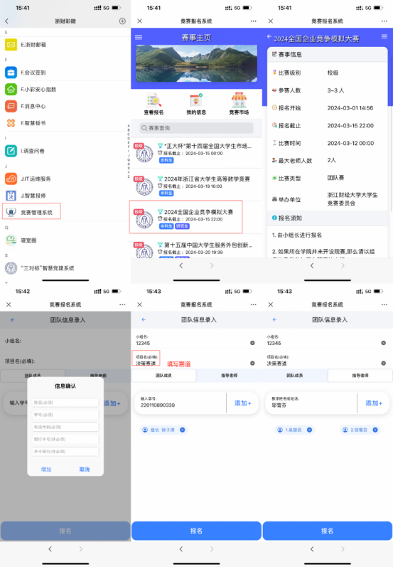 竞赛管理系统(信息门户—我的应用—搜索竞赛管理系统—添加常用),在系统中进行确认审核,完成校赛报名整体环节。