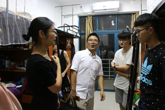 离开女生宿舍后,老师们来到了男生宿舍。他们走访了部分寝室,亲切地和同学们拉起家常,询问同学们生活方面的情况,提醒同学注意天气变化。不禁让同学们感到格外的亲切,原来的拘束减去不少,同学们也跟老师们分享自己初到宿舍的感受。一位新生提到,这是自己第一次离家这么远,对自己独立生活能力是次考验,他也表示在大学里会努力学会照顾自己,更要学会照顾他人,和室友愉快地相处。