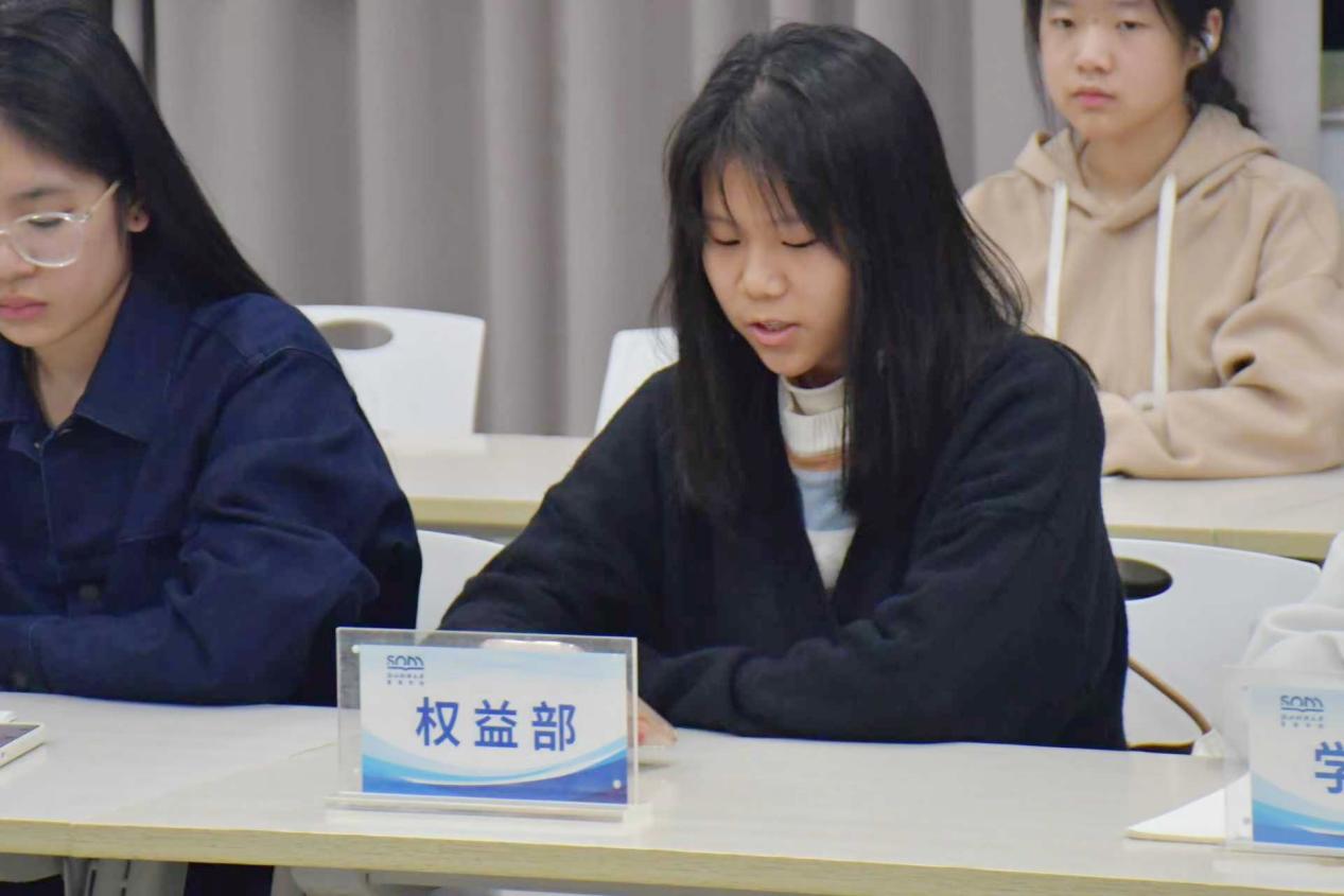 权益部负责人吴瑞芳指出,校训“进德修业,与时偕行”的精神正通过校风、教风、学风的“三风建设”得以生动实践。她表示,优良校风是学校的灵魂,学生会成员应以身作则,从维护环境、遵守制度做起,权益部也将积极收集同学诉求,让校风建设更接地气、有温度;教风是教学质量的保障,学生干部应带头尊重老师劳动,搭建良好师生沟通渠道,传承严谨治学的育人精神;学风是学生成长的基石,尤其需要勤奋务实,权益部将配合学院组织学习交流活动,营造比学赶超的氛围。吴瑞芳强调,“三风建设”需每位同学从身边小事践行,学生会更应扛起责任,在服务同学中推动其落地生根、开花结果。