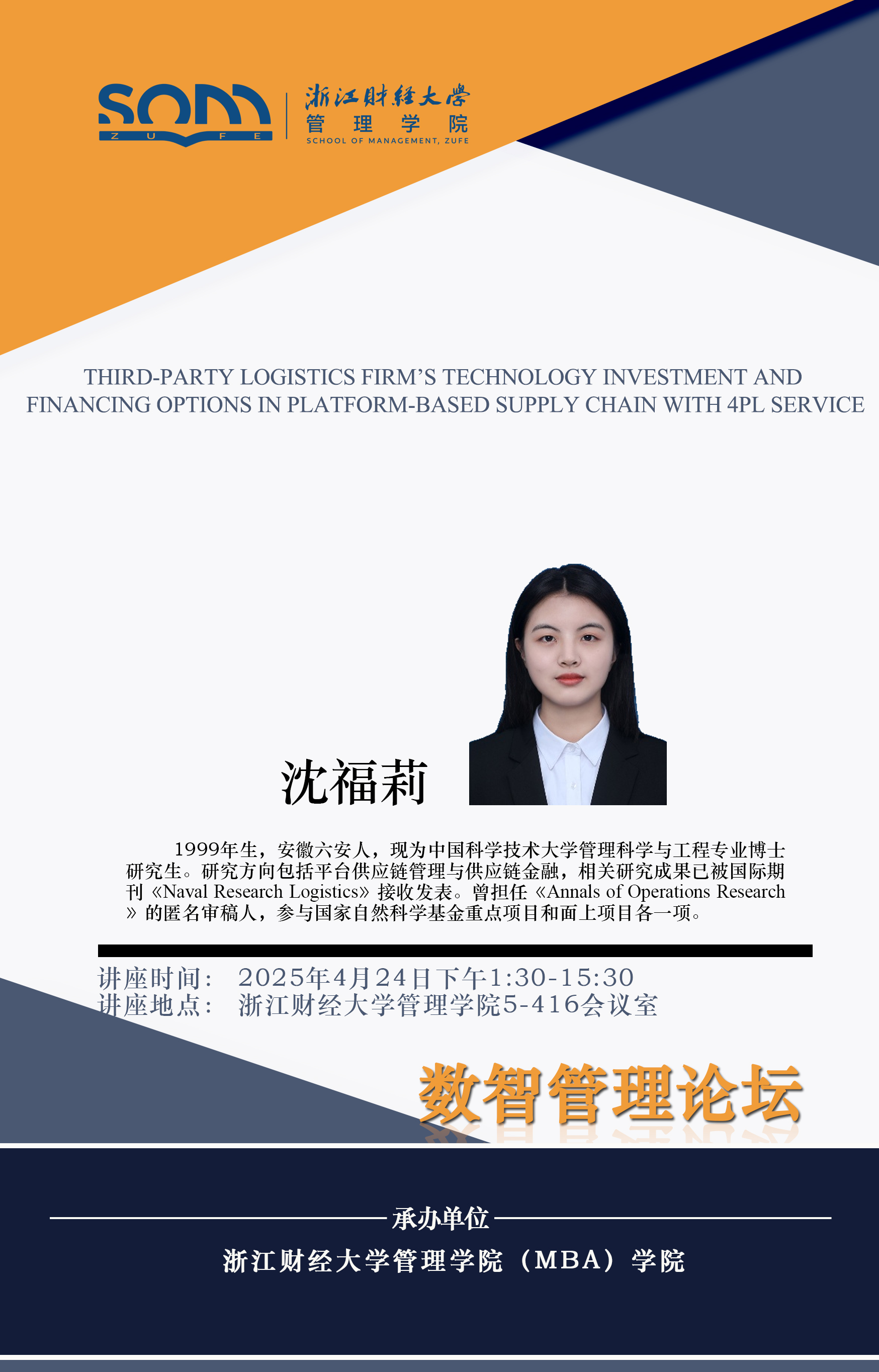 肉漫屋 新财经战略系列学术活动2025年第17期【学术报告】沈福莉:Third-party logistics firm’s technology investment and financing options in platform-based supply chain with 4PL service (第三方物流企业技术投入和融资策略研究)