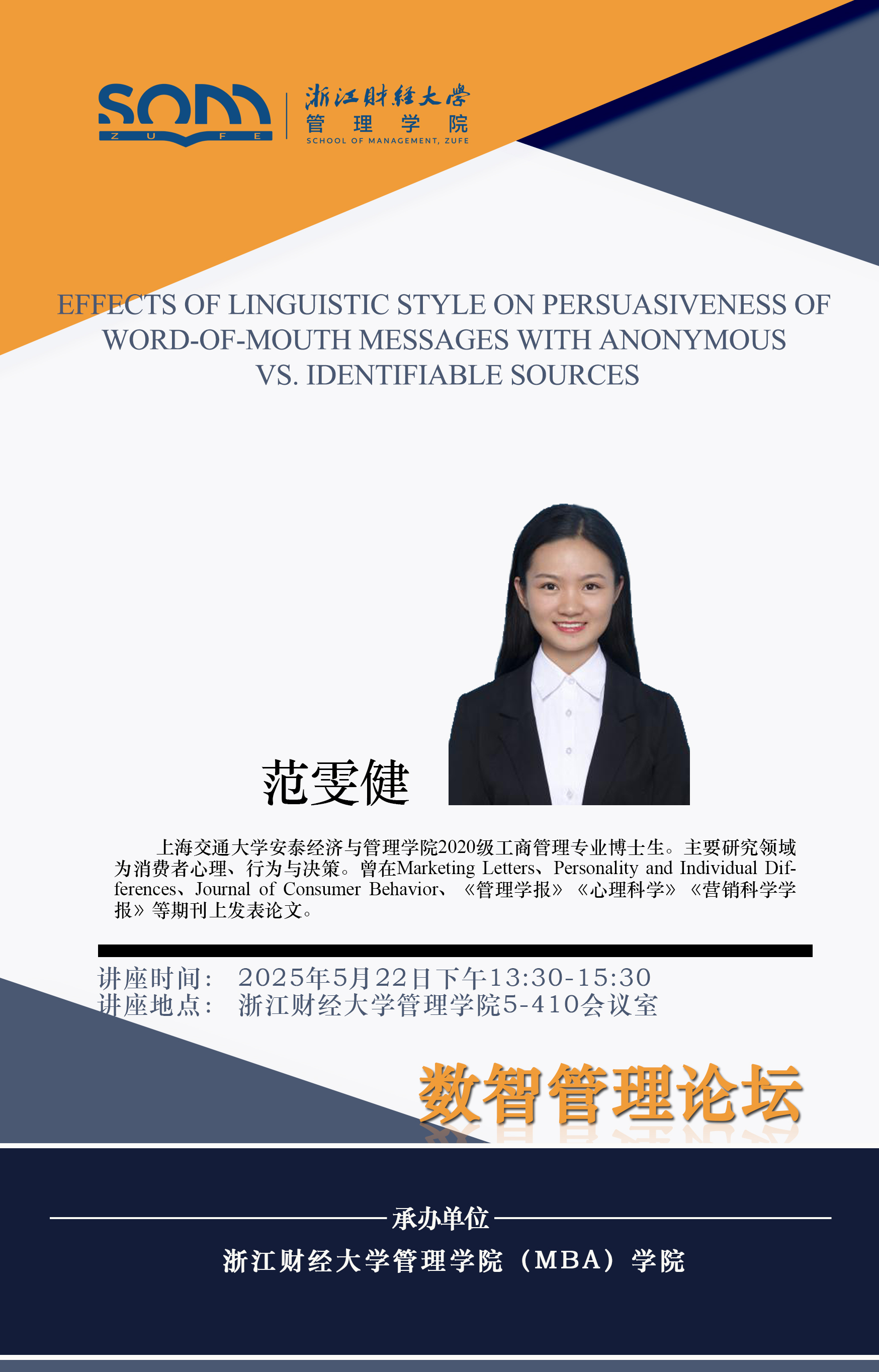 肉漫屋 新财经战略系列学术活动2025年第36期【学术报告】范雯健:Effects of linguistic style on persuasiveness of word-of-mouth messages with anonymous vs. identifiable sources