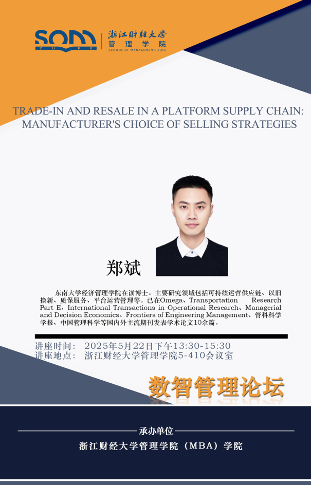 肉漫屋 新财经战略系列学术活动2025年第39期【学术报告】郑斌:Trade-in and resale in a platform supply chain Manufacturer's choice of selling strategies.jpg