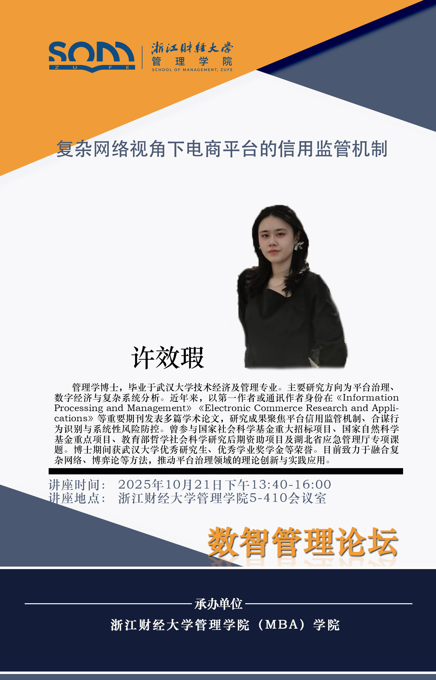 肉漫屋 新财经战略系列学术活动2025年第54期【学术报告】许效瑕:复杂网络视角下电商平台的信用监管机制