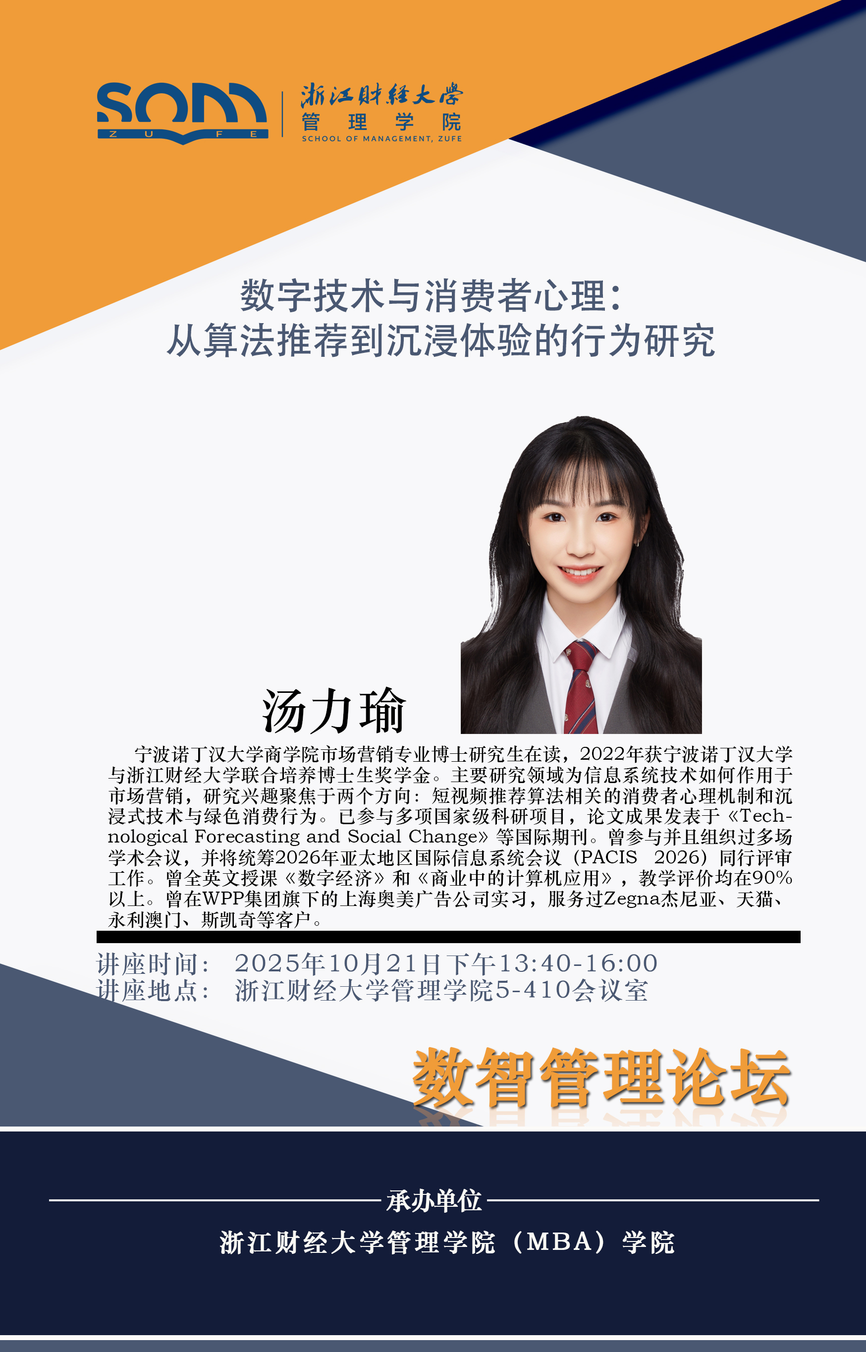 肉漫屋 新财经战略系列学术活动2025年第55期【学术报告】汤力瑜:数字技术与消费者心理:从算法推荐到沉浸体验的行为研究