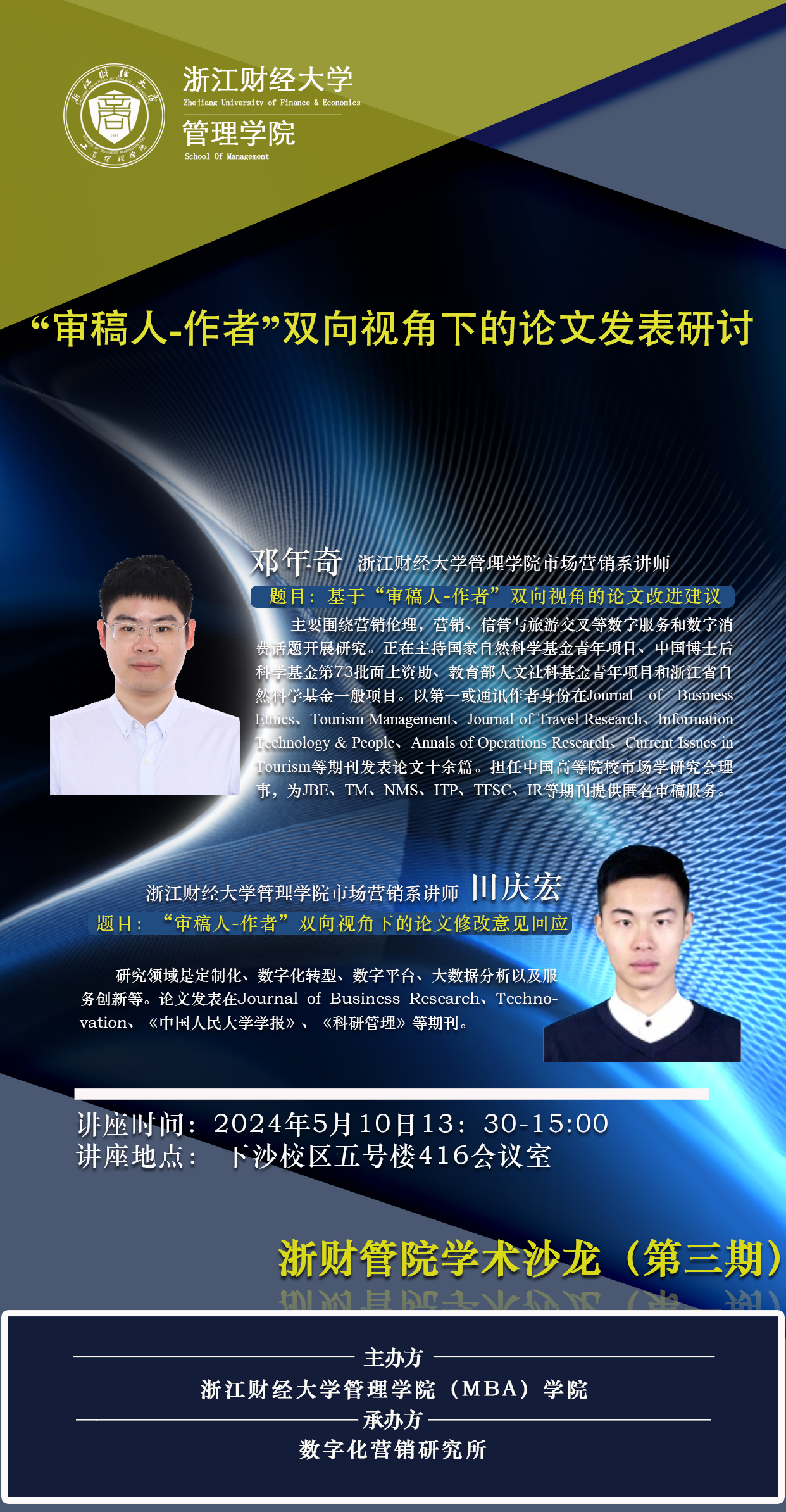 【浙财管院学术沙龙(第三期)预告】邓年奇、田庆宏:“审稿人-作者”双向视角下的论文发表研讨