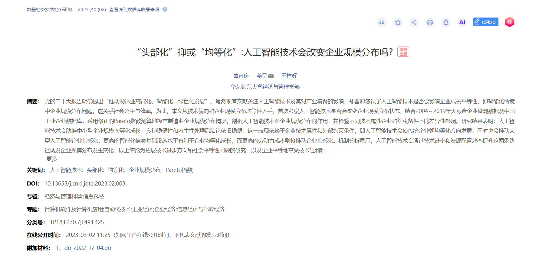 【成果名称】“头部化”抑或“均等化”:人工智能技术会改变企业规模分布吗?